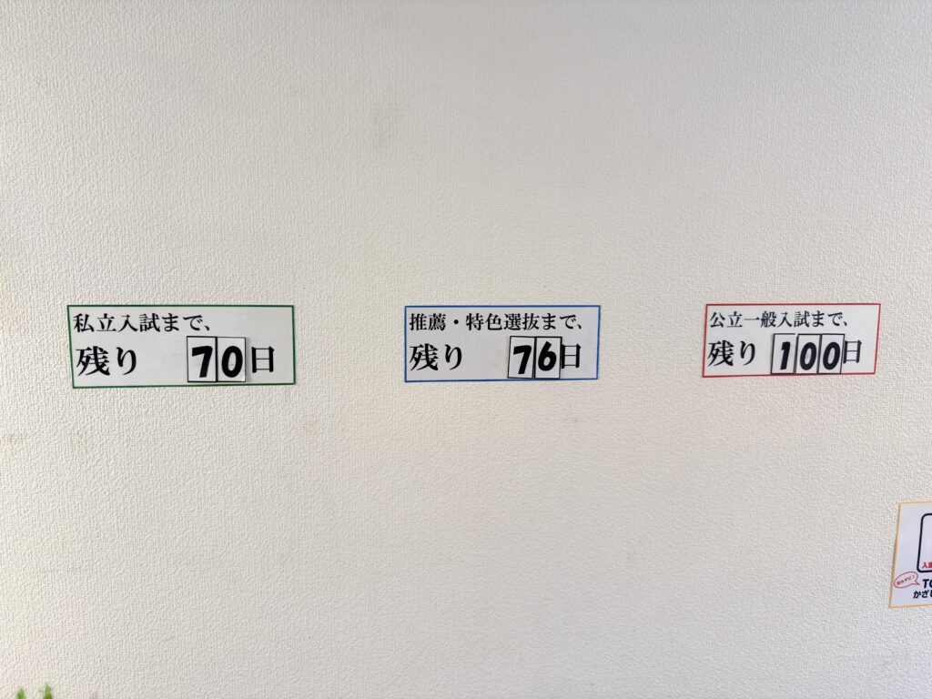 私立入試まで残り70日、公立推薦入試まで残り76日、そして公立一般入試まで残り100日。
